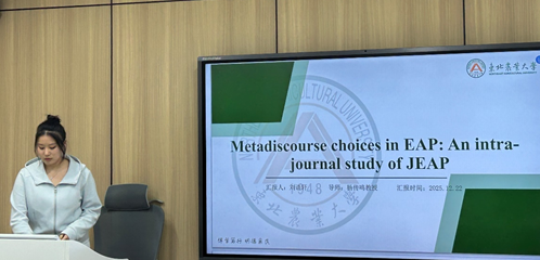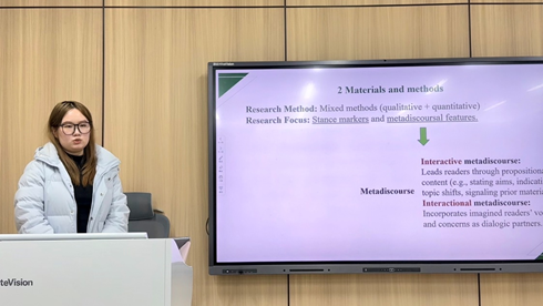 研究生刘语轩汇报了Metadiscourse choices in EAP: An intra-journal study of JEAP。该研究以学术英语(EAP)领域旗舰期刊Journal of English for Academic Purposes为研究对象,通过对20年间441篇论文的分析,系统考察了不同研究导向(文本导向、批判导向、情境导向和教学导向)中元话语资源的使用差异。研究发现,不同导向论文在元话语选择上的差异与其研究方法和认知取向密切相关,文本导向论文元话语使用最为密集,而教学和批判导向论文相对较少。该成果揭示了EAP领域内部的话语多样性,为相关研究、教学实践及期刊写作规范的理解提供了重要启示。
