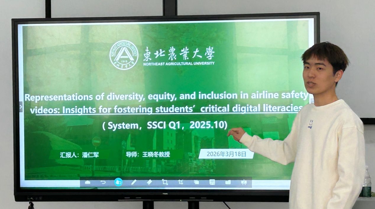 研究生潘仁军分享《航空公司安全视频中多样性、公平性与包容性的表征:培养学生批判性数字素养的启示》,本文通过批判性多模态分析,比较两部相隔11年的航空公司安全视频,探讨企业如何通过语言和视觉资源呈现多元、公平与包容(DEI)价值观,揭示其背后的权力关系变化,并强调该分析对ESP教学中提升学生数字素养的意义。