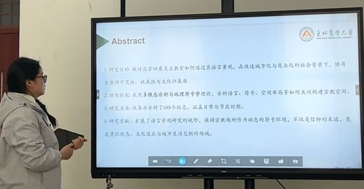 研究生李雪丽在文献阅读会上分享《神圣的本地化:北京天主教会语言景观的社会语言学研究》,本研究分析北京四所天主教堂的600多个语言景观标识,探讨宗教机构在城市化中的符号策略。中文标识体现国家合法性,拉丁语维系宗教传统,英语展示国际性,节庆商业文本融入本地文化。教堂成为神圣与世俗话语共存的混合空间,拓展了语言景观研究范围。