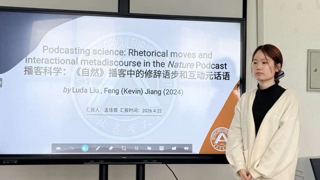 孟佳蓉同学以《Podcasting science: Rhetorical moves and interactional metadiscourse in the Nature Podcast》为题,对《自然》播客进行修辞语步与互动元话语分析,归纳5大核心修辞结构,揭示主持人与科学家的话语分工特征,拓展了科学传播话语的研究视角。
