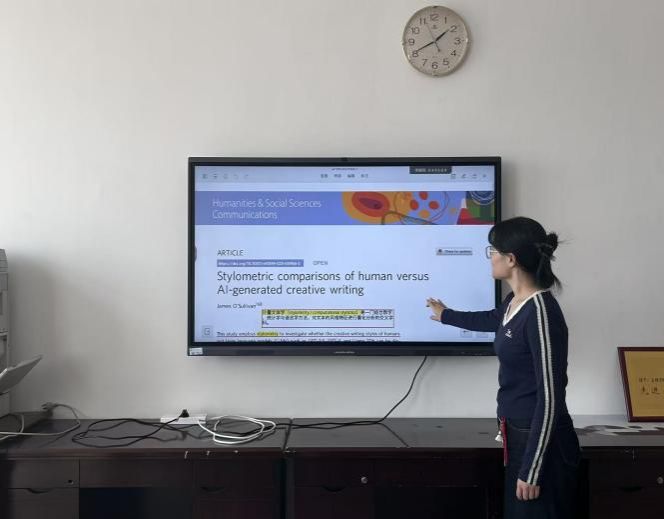 荆乐同学围绕《Stylometric comparisons of human versus AI-generated creative writing》展开汇报,系统讲解计量文体学核心方法,以“伯罗斯德尔塔”指标为工具,对比人类与AI生成文本的风格特征。研究证实AI生成文本风格高度趋同、聚类紧密,而人类创作风格更具差异性与独特性,为辨析AI创作、坚守学术诚信提供量化依据与伦理思考。